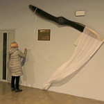 Ofiarodawczyni Danuta Piotrowska dokonała odsłonięcia pamiątkowej ekspozycji, która na ścianie hangaru pozostanie już na stałe.