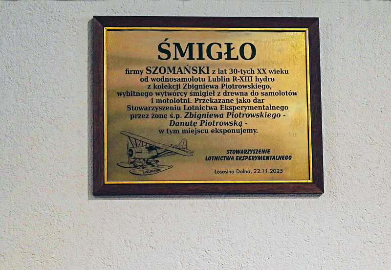 Działo się to 22 listopada 2025 w hangarze reprezentacyjnym Aeroklubu Podhalańskiego w Łososinie Dolnej, w którym Stowarzyszenie Lotnictwa Eksperymentalnego wraz z Zarządem Aeroklubu postanowiło urządzić ekspozycję symbolizującą polską drogę rozwoju lotnictwa. Przez dziesięciolecia emblematem rozpoznawczym awiacji był wizerunek śmigła. Stąd wykorzystanie ofiarowanego w szlachetnym darze śmigła firmy Szomański, a zamieszczona obok tablica informuje także o jego poprzednim właścicielu.